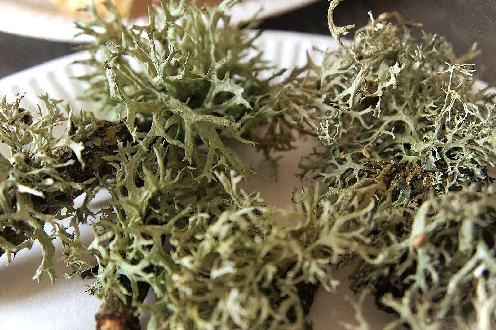 Oak moss grows on the bark of the oak trees but can also be found growing on coniferous trees and some older fruit trees. The pale greenish gray body, 3 to 8 cm long, is branched and slightly resembles mini stag horns, ending in pointed tips. The top is light green and warty. The undersurface is a whitish colour.