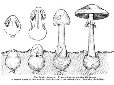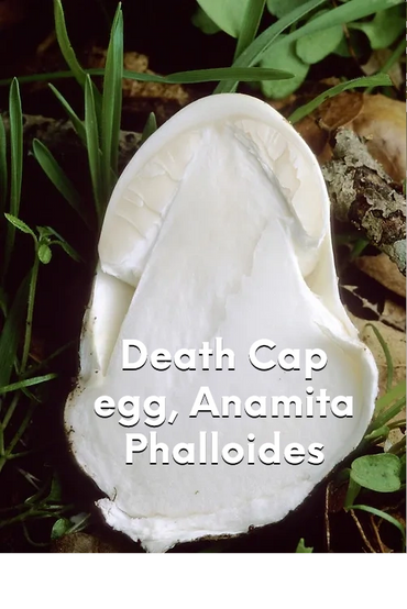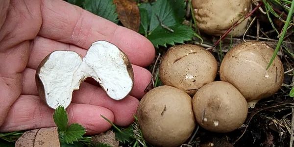 Although puffballs are edible, Make sure to rule out poisonous look-alikes before eating any! Cut puffballs in half from top to bottom and look closely at the cut surface. The outer rind should be as thin as an eggshell; if thicker, the fungus may be a poisonous Scleroderma sp commonly known as the common earthball, pigskin poison puffball, or common earth ball. .The interior of an edible puffball should be white and completely uniform. If a small mushroom shape is folded inside like the photo below, the specimen may be the 'egg' stage of a deadly or dangerous species such as the death cap, Amanita phalloides. If the inside is yellow or brown, the specimen is too old and bitter to eat. .
